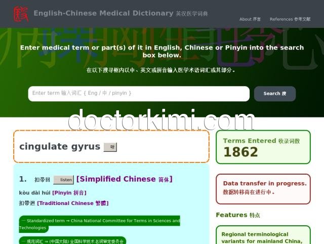 English-Chinese Medical Dictionary 英汉医学词典 - English-Chinese Medical Dictionary 英汉医学词典 - Physician-compiled English-Chinese dictionary / glossary of medical terms as used by healthcare professionals in China, Hong Kong and Taiwan. Audio pronunciation, hanyu pinyin, and both simplified as well as traditional characters are provided. 中港台英汉医学术语词典, 附加拼音、简繁体及音频发音。